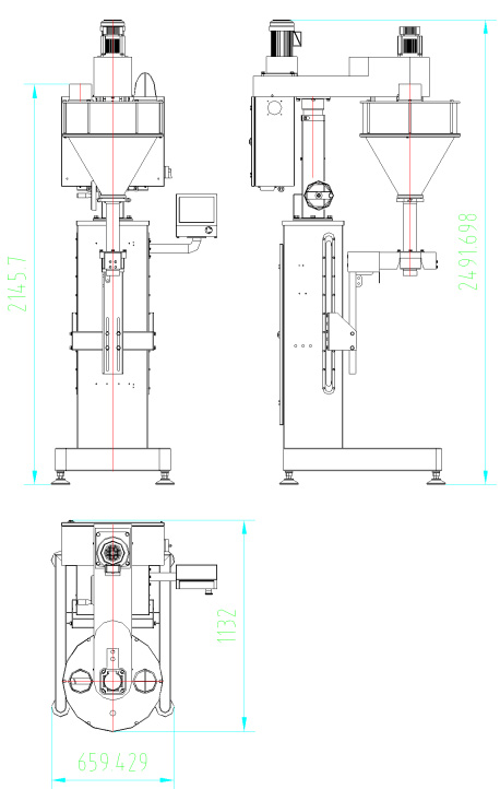 工作流程:人工套袋或人工放罐 → 容器升高 → 快速充填,同時容器下降 → 重量達到預量值 → 慢速充填 → 重量達到目標值 → 人工取出容器。